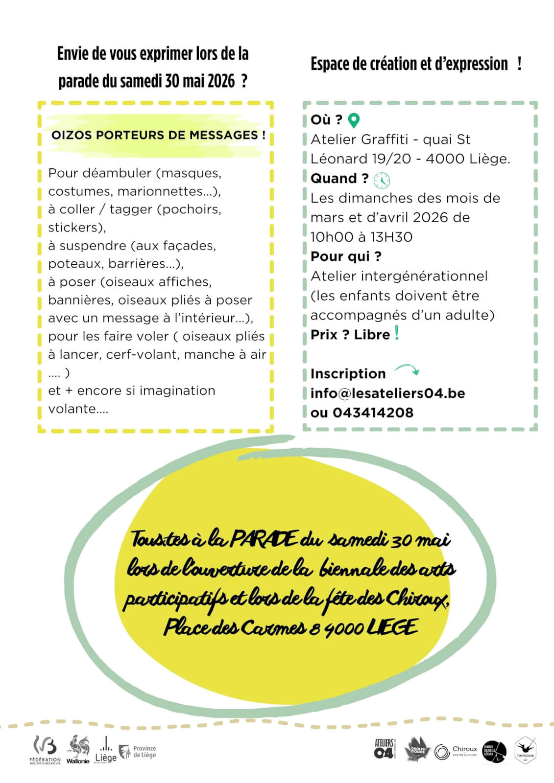 Cet espace-temps est un atelier d’expressions multiples dédié aux personnes qui veulent parader avec les Drôles d’Oizos le samedi 30 mai 2026 lors de la biennale des arts participatifs et la fête des Chiroux, Place des Carmes 8 4000 Liège.